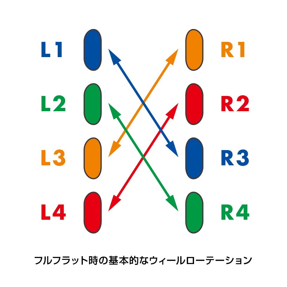 まず最初にやることになるローテーションは、ウィールの内側と外側をひっくり返す、という簡単なもの。(参照:図1